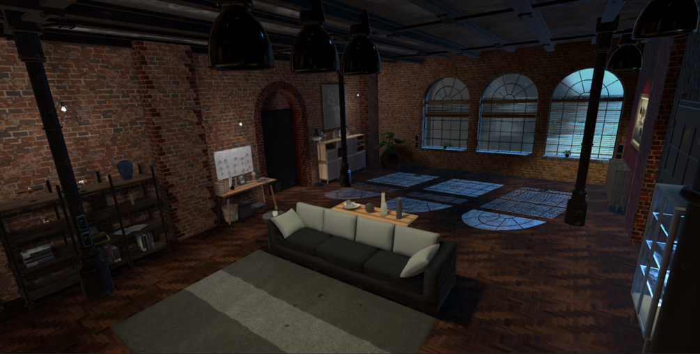 Inspired by more dreams of places like this, I created a new york style apartment in a way that celebrates the beauty of exposed brick, in a warm and dark environment to be with your friends and anyone else, featuring a working sliding door to the bedroom, a video and stream player that's fully customizable (credit: Architechanon's ProTV), and many places to sit or lay and relax in front of a mirror, a Bed, or even a calm galaxy reflected waterscape.