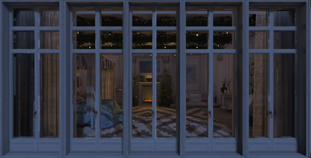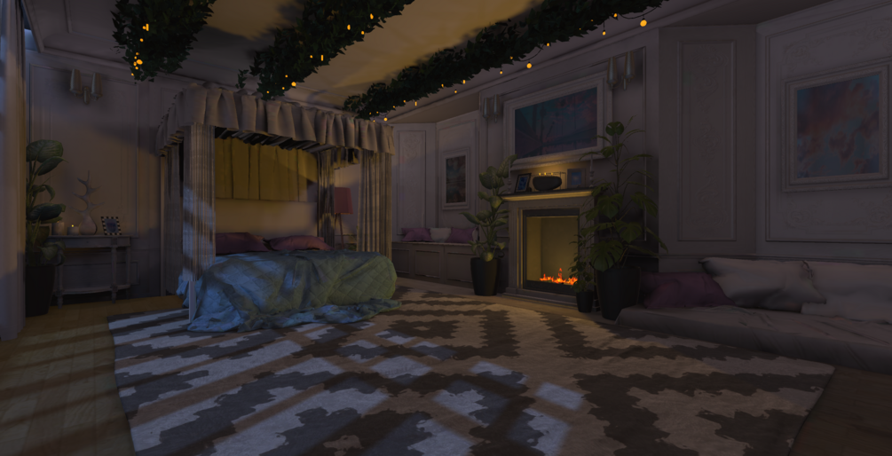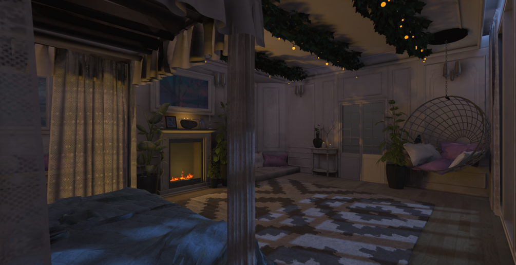 Inspired from dreams of a place like this when i sleep i recreated French architecture in a way that melded modern and classical design, to create a cozy and warm place to be with you and your friends, featuring a working fireplace with sounds, a music player that's fully customizable, and many places to sit or lay and relax in front of a mirror, a fire, or even a calm galaxy reflected waterscape.